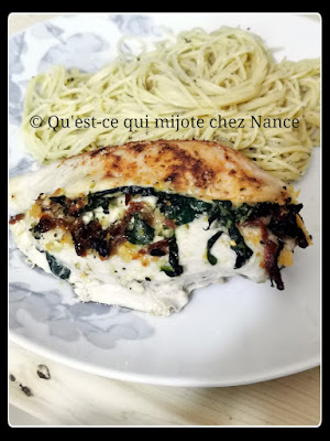 6. Répartir le mélange d'épinards entre les poitrines de poulet et farcir chacune, environ ¾ tasse chacune. Si nécessaire, vous pouvez utiliser des cure-dents pour fermer la poitrine de poulet.